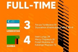 赞比亚女足在上半场建议了3-0的领先优势。易边再战,乌兹别克斯坦女足扳回一球后,赞比亚女足再入一球,将比分扩大为4-1。全场补时阶段,乌兹别克斯坦女足球员哈比布拉耶娃连入两球,将比分追至3-4,但最终仍为时已晚,乌兹别克斯坦女足3-4遗憾输球。